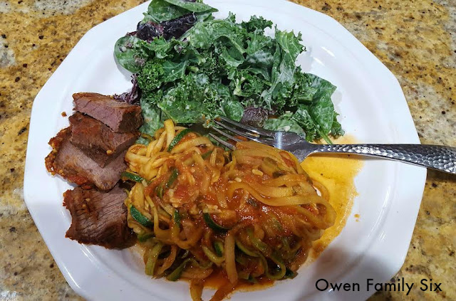 Kale Caesar salad w/elk loin and zucchini noodles w/sauce.